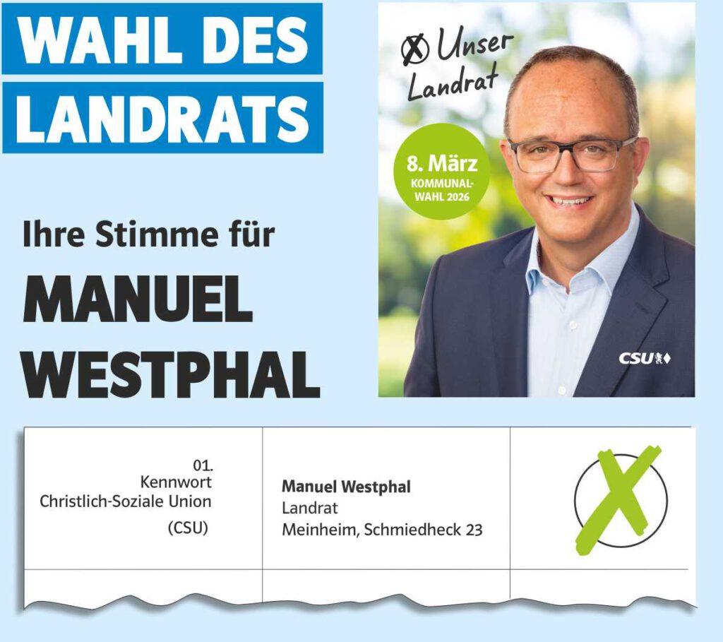 Unsere Heimat ist stark, lebenswert und vielfältig. Das verdanken wir dem Engagement vieler Menschen, die sich Tag für Tag für unseren Landkreis einsetzen. Diesen erfolgreichen Kurs möchte ich fortsetzen. Mit Erfahrung, Verantwortung und Verbundenheit zu den Menschen in unserer Heimat.
